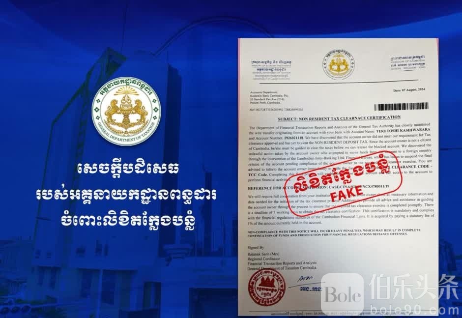 伯乐头条专讯:8月9日,柬埔寨国家税务总局表示,有人伪造税务总局的文件,因此希望当局展开调查,以依法处理伪造该文件的人。