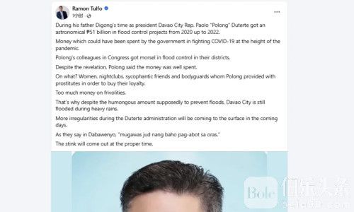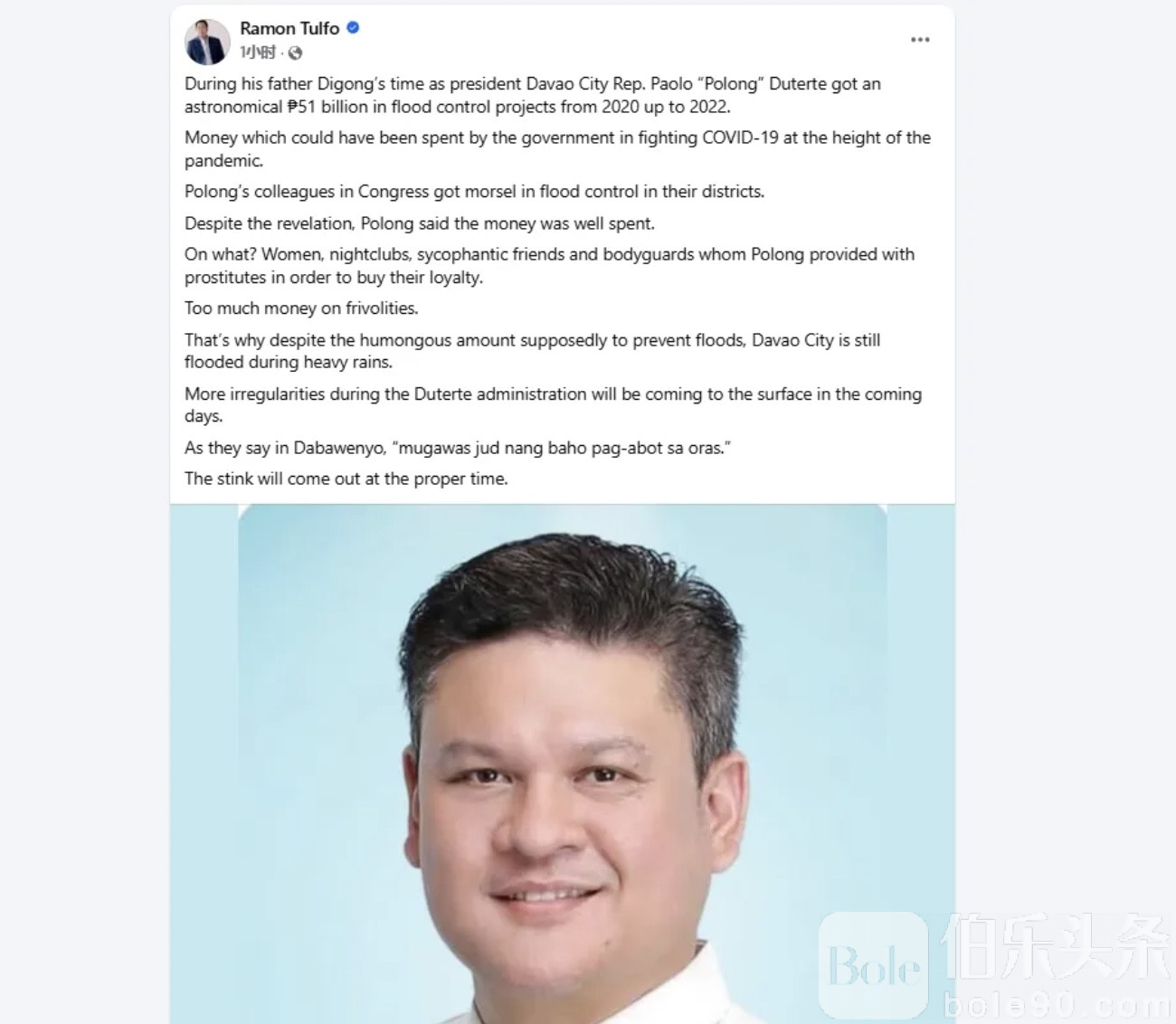 伯乐头条专讯:9月10日,菲律宾资深媒体人拉蒙·图尔福(Ramon Tulfo)在脸书上爆料,直指前总统罗德里戈·杜特尔特的长子、达沃市众议员保罗·“波隆”·杜特尔特,在2020年至2022年间获得了高达510亿比索的防洪项目资金,但资金使用去向却极具争议。