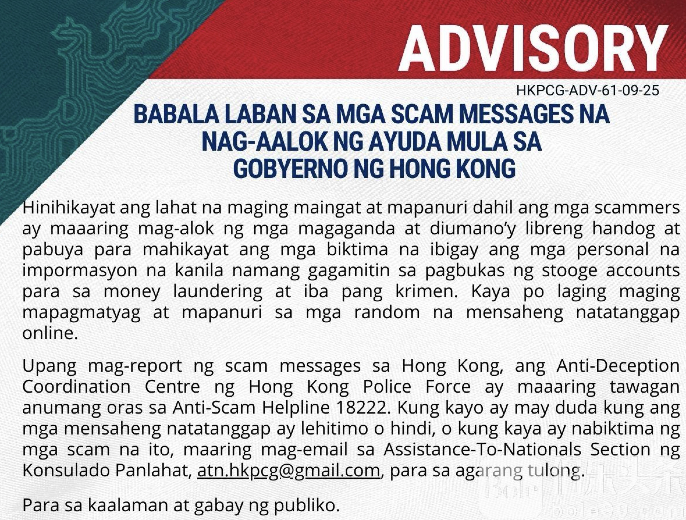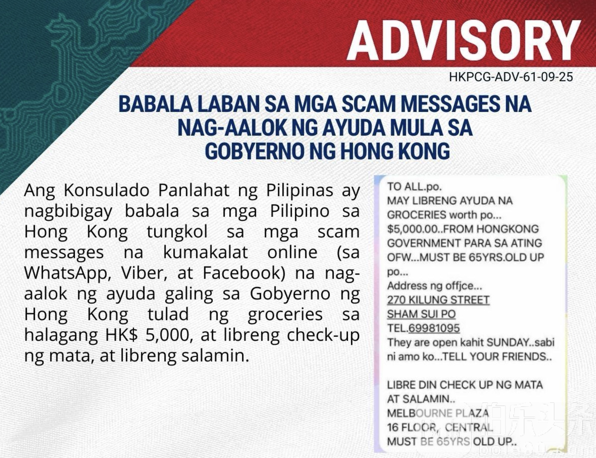 伯乐头条专讯:菲律宾驻香港总领事馆近日发布紧急提醒,警告在港菲律宾劳工务必提高警惕,谨防以“政府援助”为幌子的诈骗陷阱。