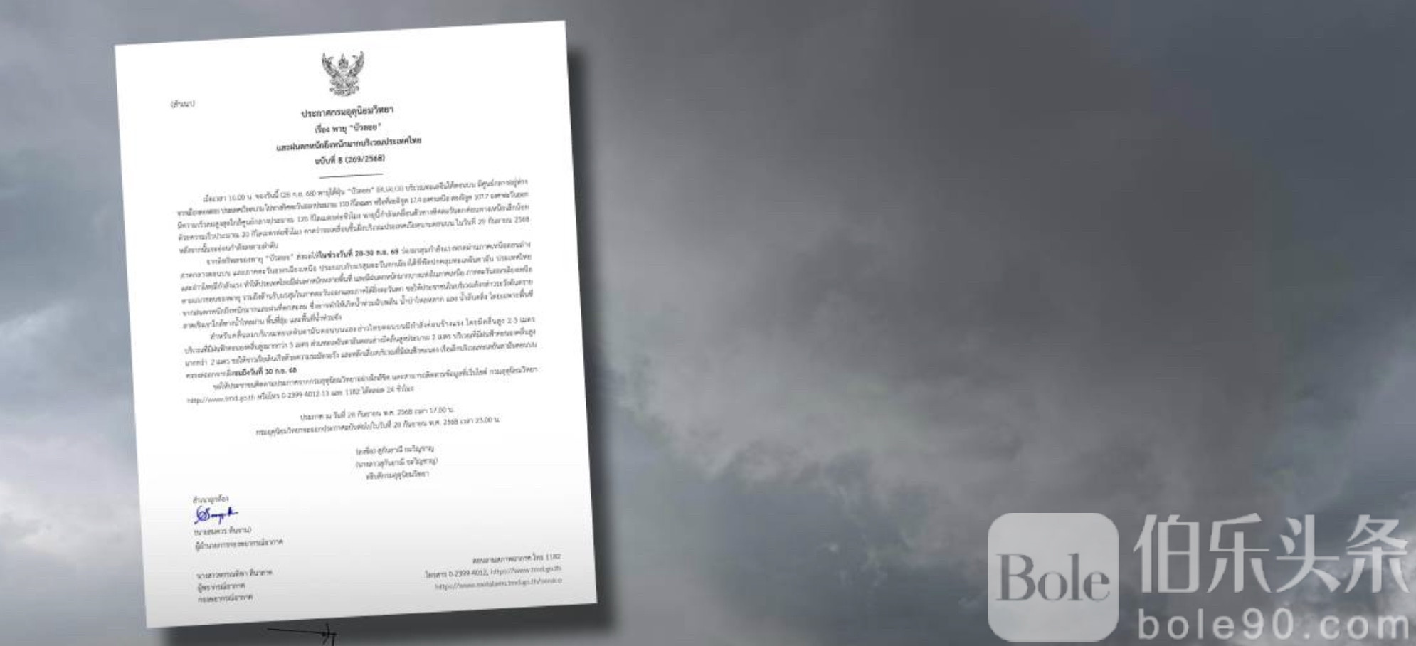伯乐头条专讯:泰国气象局于9月28日下午发布第8号台风警报,提醒全国范围内因台风“布拉洛”可能出现的暴雨、山洪、河水暴涨和堤坝溢流风险。该台风中心位于越南东北部东偏北约110公里处,最大风速约每小时120公里,并以每小时20公里速度向西北方向移动,预计9月29日登陆越南北部后逐步减弱。