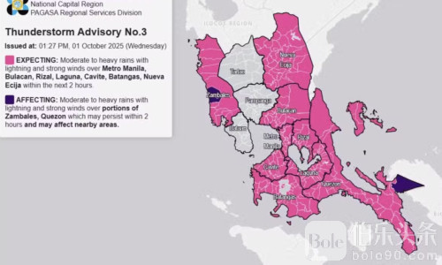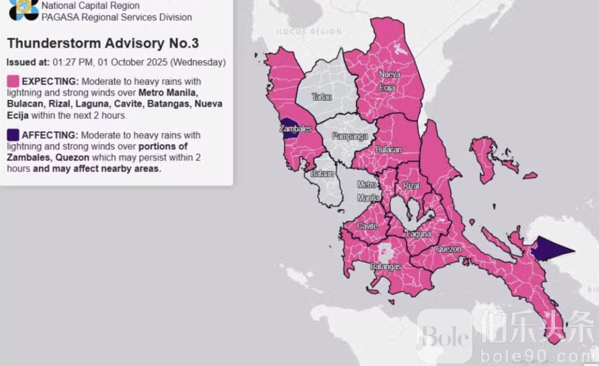 伯乐头条专讯:菲律宾气象局(Pagasa)1日发布雷暴警报,预计未来两小时内,马尼拉都会区及邻近省份将出现中到大雨。受影响地区包括布拉干、黎刹、拉古纳、卡维特、巴坦加斯和新埃西哈省。