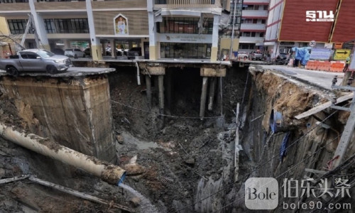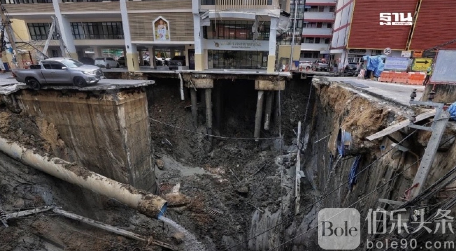 这起塌陷事件发生在9月24日,地点就在Vajira医院门前。塌陷导致地面出现巨大空洞,最深处达25米,连建筑桩基都完全暴露。施工人员曾多次尝试抢修,向塌陷区域反复回填沙土,但地基仍不断下沉,始终无法稳定。