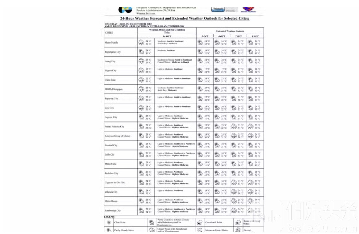 伯乐头条专讯:菲律宾气象局(Pagasa)10月4日早间发布最新天气预报,指出大马尼拉地区及周边多个省份当天将出现多云、阵雨及雷暴天气。气象局提醒民众外出务必携带雨具,注意防范突发强降雨与闪电。