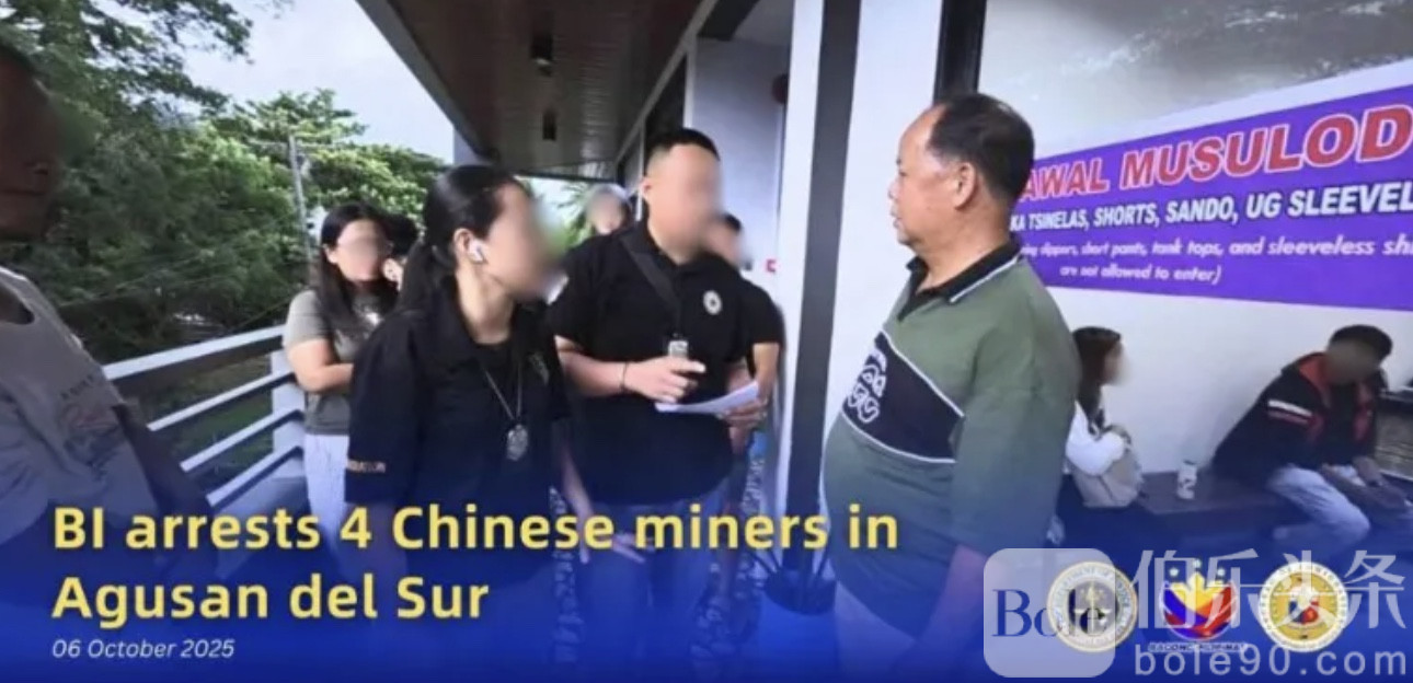 伯乐头条专讯:菲律宾移民局10月6日通报,当局于10月1日在棉兰老岛东北部阿古桑南省圣弗朗西斯科镇(San Francisco, Agusan del Sur)逮捕了4名中国公民,原因是他们涉嫌非法采矿及违反《菲律宾移民法》。