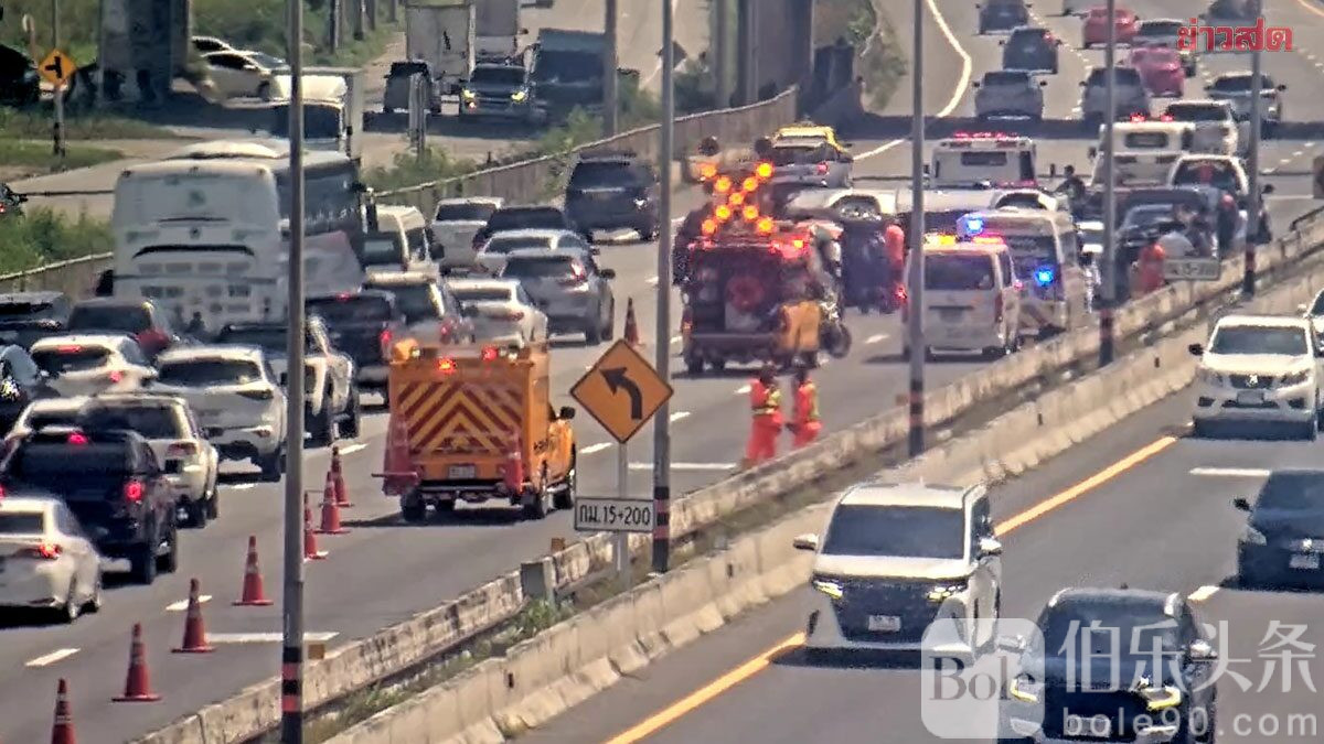 伯乐头条专讯:10月12日上午,泰国7号公路高速出站路段(约15+300公里处)发生严重连环车祸,共7辆汽车及一辆皮卡车相撞,造成道路严重堵塞,车流回堵长达约8公里。