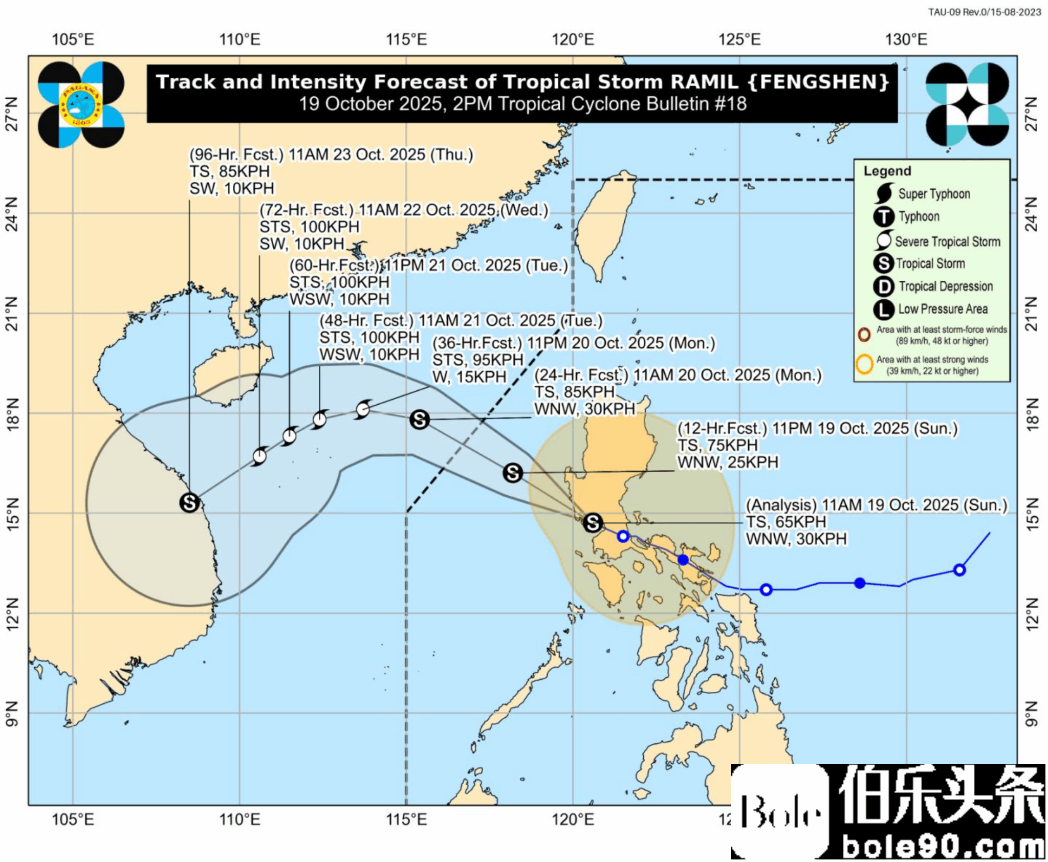 据菲律宾大气地球物理和天文服务管理局(PAGASA)10月19日上午11时的数据,“拉米尔”中心位于马尼拉湾以北14.6度,向西北方向移动,风速每小时65公里,阵风可达每小时90公里。多个省份仍悬挂热带气旋风暴警报,其中包括一级和二级警报区域,涵盖北吕宋和中吕宋的多个省份。