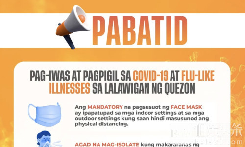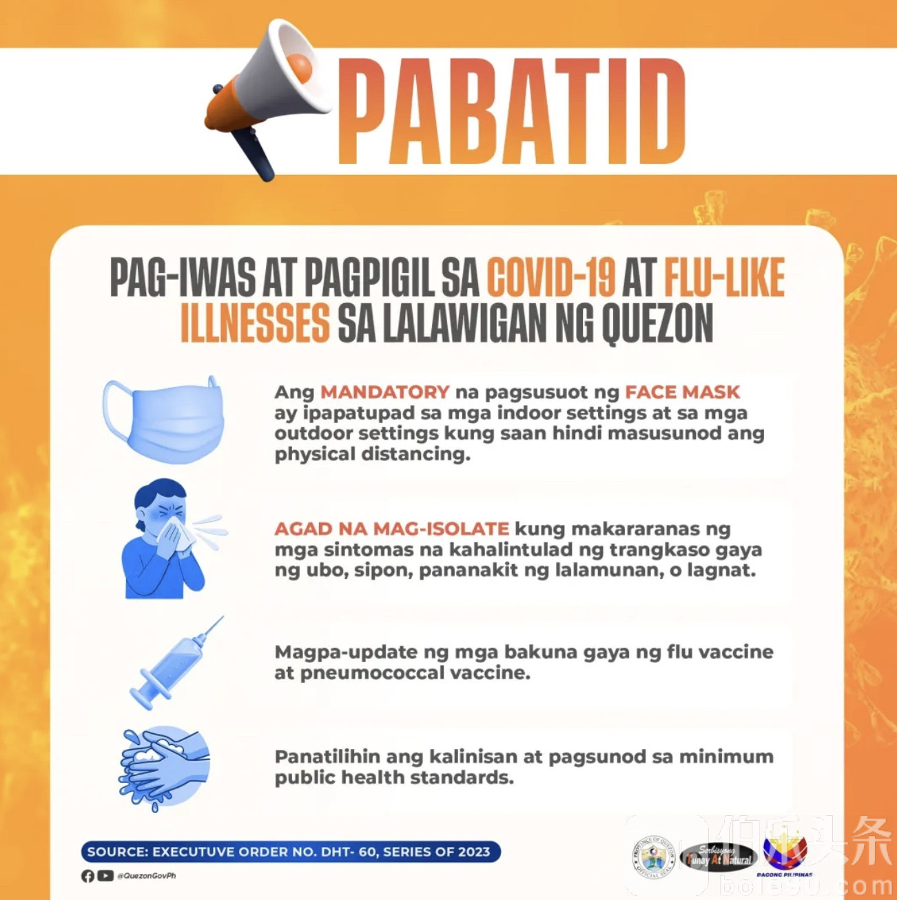伯乐头条专讯:菲律宾奎松省(Quezon)近日正式发布行政命令,宣布重新实施强制口罩措施。根据最新规定,所有民众在室内场所及无法保持社交距离的户外区域都必须佩戴口罩,以防止新冠病毒及流感病毒的扩散。