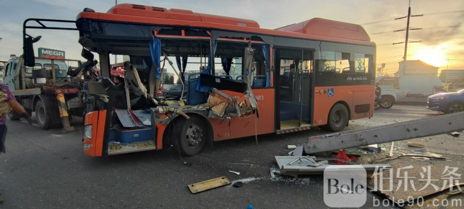 事故发生在10月23日凌晨5点30分,地点位于巴吞他尼府孔銮区帕洪育庭公路(Klong Luang, Pathum Thani)曼谷大学前路段。警方与救援人员到场后发现,公交车车头严重变形,混凝土桩从车头刺入驾驶区,碎玻璃散落一地,导致交通严重受阻,车龙一度延伸超10公里