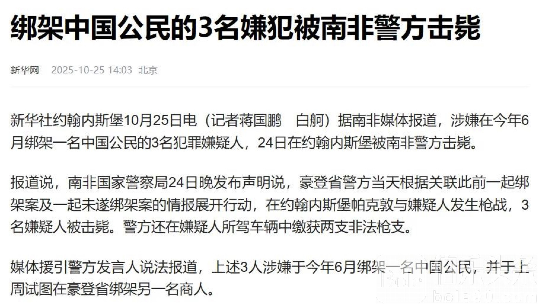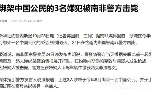 伯乐头条专讯:南非警方在约翰内斯堡成功击毙3名涉嫌绑架中国公民的犯罪嫌疑人,现场发生激烈枪战,场面一度紧张。据新华社援引南非媒体消息,这三人正是今年6月策划并实施一起针对中国公民绑架案的主犯。