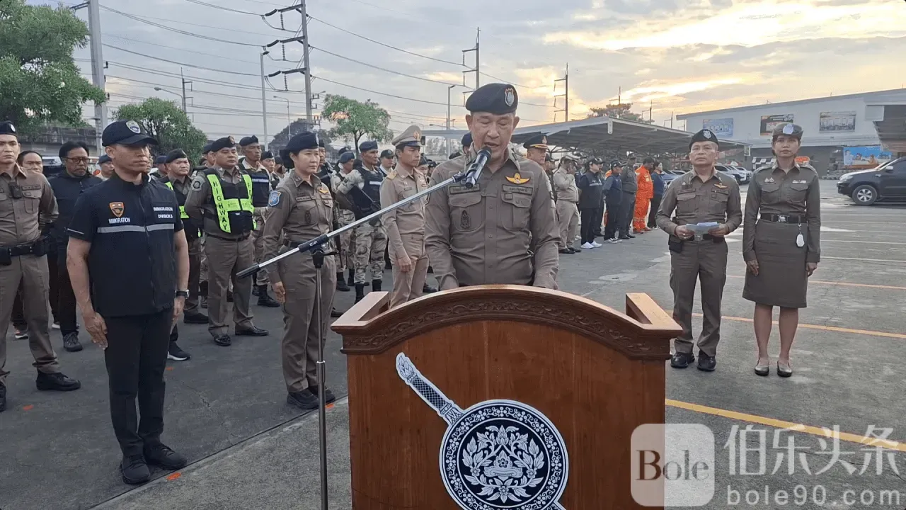此次行动由帕图姆塔尼府警察总监皮拉蓬率领辖区刑侦、边防、旅游警察、交警等警力,与地方行政、村长、志愿防护队、救援组织等约200名人员联合参与。现场各单位统一列队、检阅装备,展示强大治安防控能力。