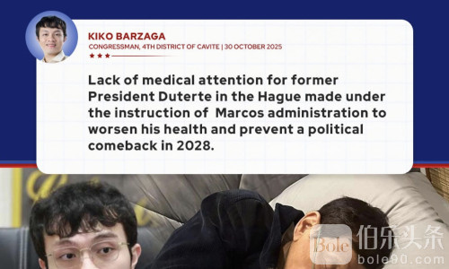 伯乐头条专讯:甲美地省国会议员埃尔皮迪奥·“基科”·巴尔扎加(Elpidio “Kiko” Barzaga)近日公开指控,前总统罗德里戈·杜特尔特(Rodrigo Duterte)在荷兰海牙期间疑似未能获得应有的医疗照护,而这一切“可能是现任政府刻意为之”,目的是削弱老杜的健康状况,阻止他在2028年东山再起。