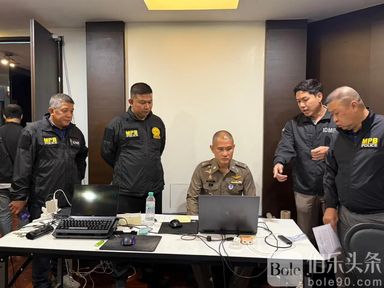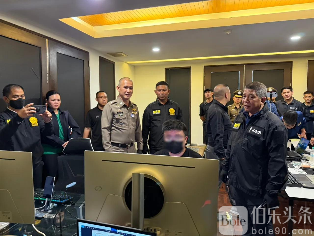 今日中午1230分,泰国警察总署反网络犯罪局局长吉拉帕·普里德指挥特警小组实施突击,成功将4名嫌犯抓获,阻止其销毁关键电脑证据。现场查获电脑主机4台(仍在运行)、手机60部、冰毒2包,以及多项高端AI设备与存储资料。