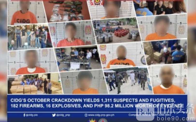 伯乐头条专讯:菲律宾国家警察刑事侦查与侦破组(CIDG)公布最新战报:2025年10月全国同步展开“猎逃缉凶”行动,期间共逮捕1311名嫌犯,查获价值超过9820万比索(约合人民币1225万元)的各类证物,成果显著。