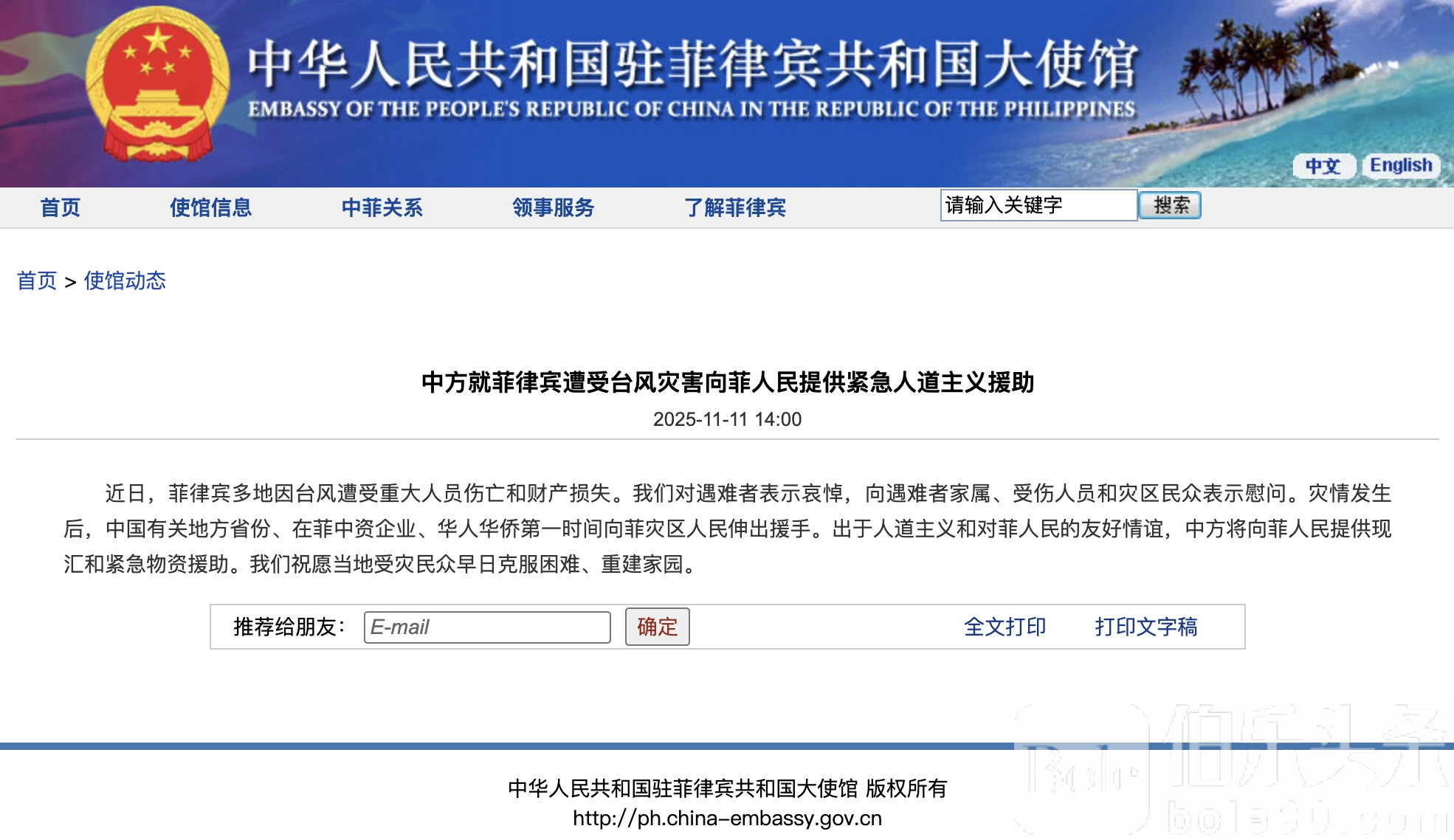 伯乐头条专讯:菲律宾多地近日遭受强台风重创,造成重大人员伤亡与财产损失。对此,中国政府表示深切哀悼,并向遇难者家属、受伤人员及灾区民众致以诚挚慰问。