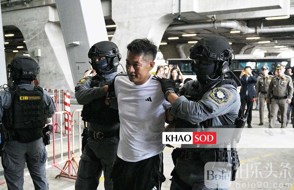 现场素万那普机场警察局设立了严密安保措施,包括警戒护栏和特勤队员巡逻,以防突发状况。记者尝试采访佘智江,他保持沉默,神情冷静,不作回应。