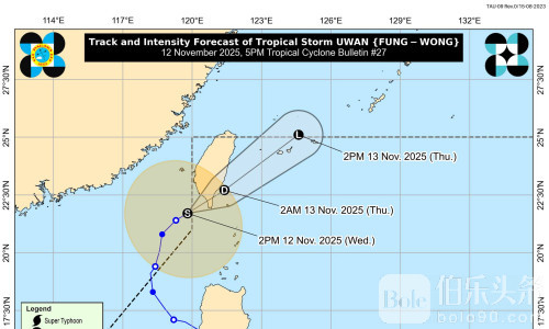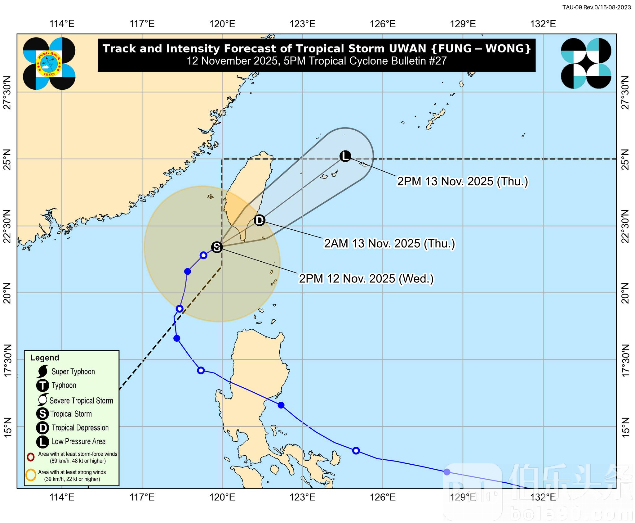 伯乐头条专讯:菲律宾气象局(PAGASA)于11月12日下午发布公告称,热带风暴“乌万”(Uwan,国际命名:Fung-wong)已重新进入菲律宾责任区(PAR),目前在北部巴丹群岛(Batanes)地区已发布一号风暴信号(Signal No. 1)