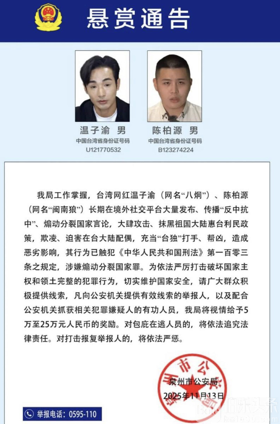 据福建省泉州市公安局11月13日公告,温子渝与陈柏源自今年3月26日起,被国务院台办认定为“台独”打手及帮凶。公安机关调查显示,两人长期在社交平台发布和传播“抗中保台”“倚美谋独”等煽动分裂国家的言论,公开攻击、抹黑大陆惠台政策,并对在台大陆配偶进行欺凌和迫害。同时,两人被认定为民进党网军的侧翼力量及西方反华势力的“急先锋”“马前卒”,造成了极其恶劣的社会影响。