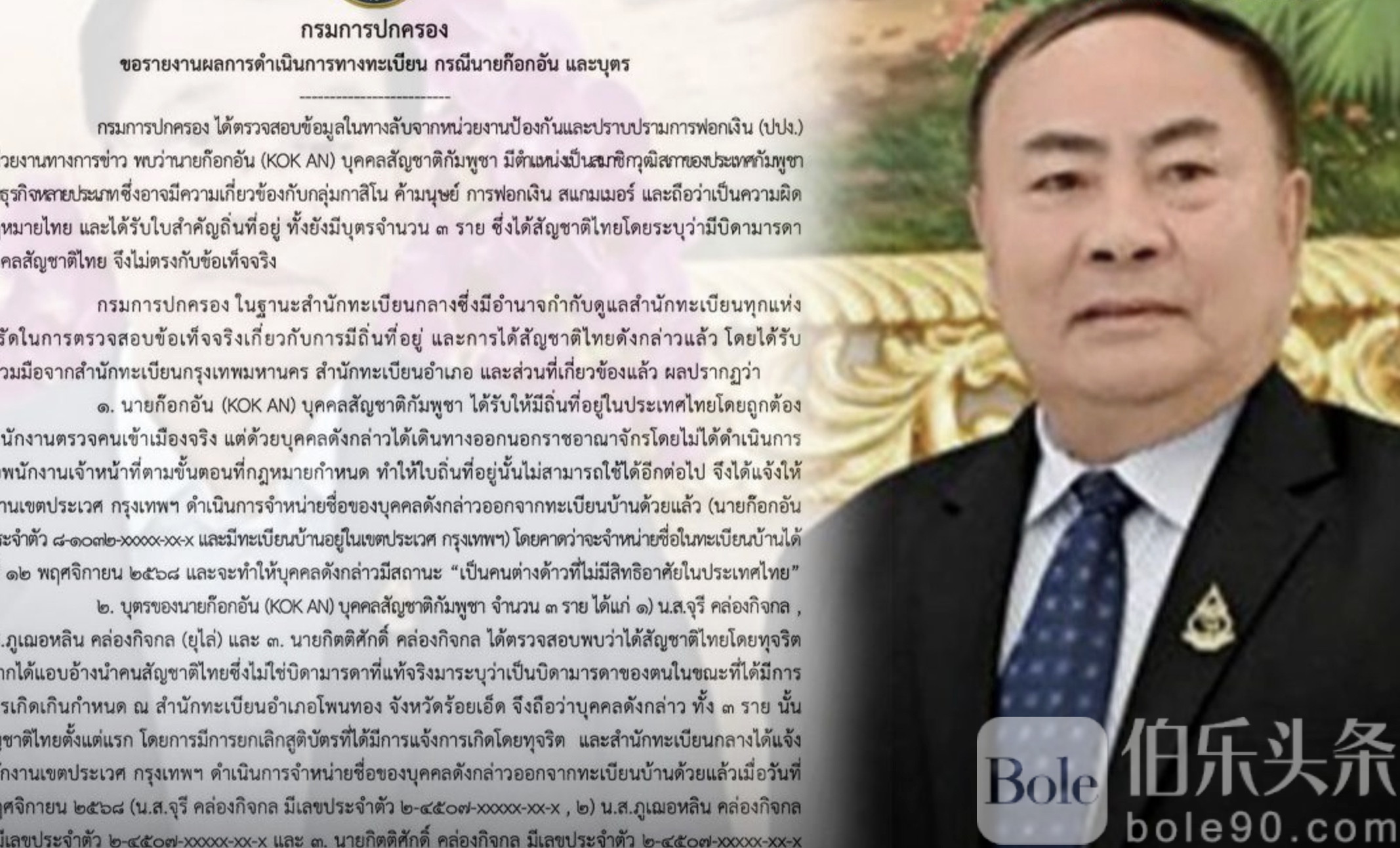 伯乐头条专讯:泰国内政部于11月13日宣布,撤销柬埔寨参议员郭安(Kok An)三名子女的泰国国籍,原因是他们在出生登记时虚假申报泰国公民为生父母。三人现被认定为“无居留权外国人”,将面临法律追究。