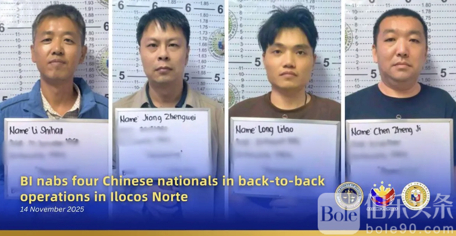 伯乐头条专讯:菲律宾移民局(BI)11月6日在伊洛科斯北布尔戈斯连续两次行动中逮捕四名中国籍人士,原因均涉及违反菲律宾移民法。此次行动由BI区域情报行动组(RIOU)主导,配合菲律宾海军、国家调查局劳阿格分局及布尔戈斯市警局展开。
