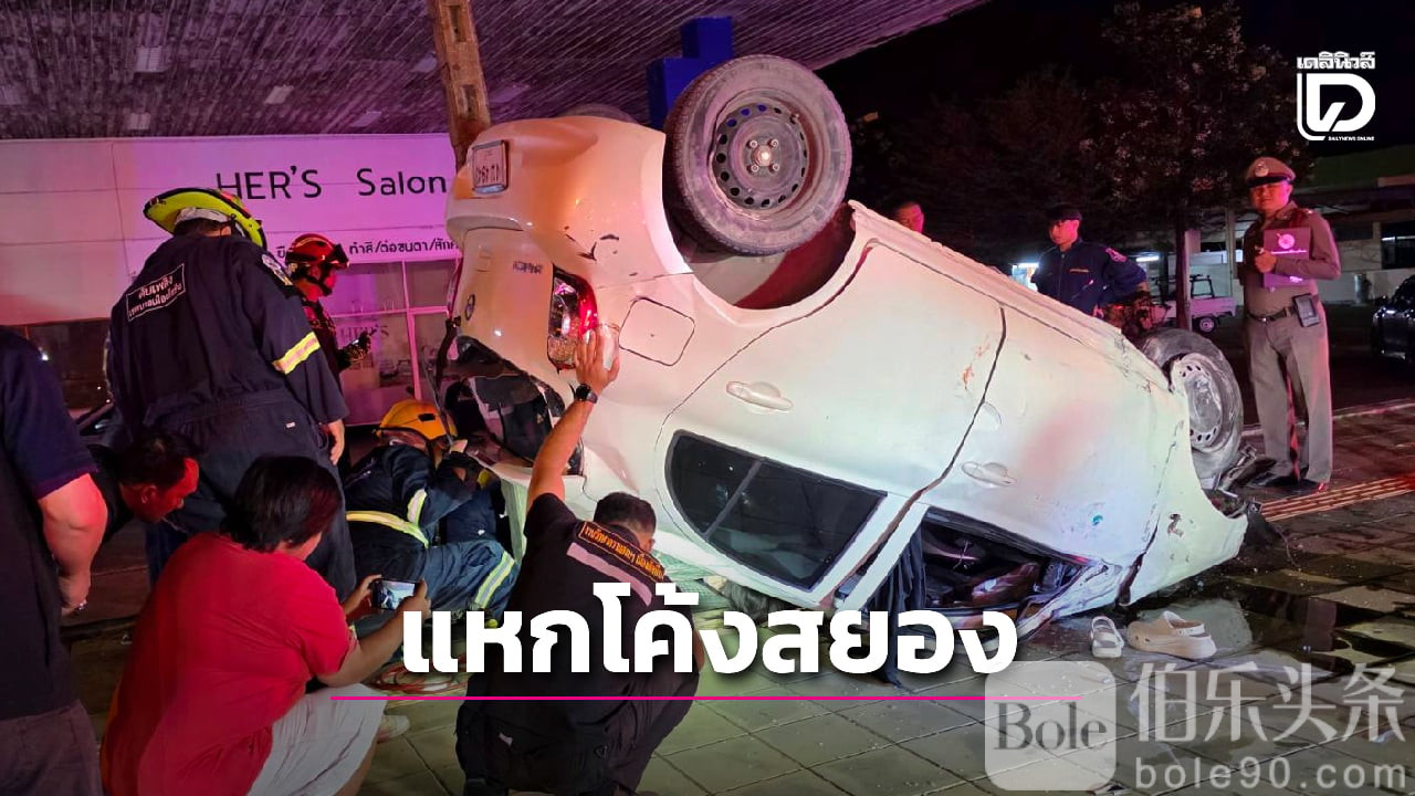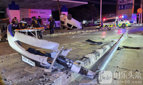 伯乐头条专讯:2025年11月17日中午,泰国春武里府沙美区发生严重交通事故,一辆白色日产March轿车在沙美路螺旋鱼叉路口失控冲出弯道,撞上路中央照明杆后翻车,造成车内五人受伤,其中两人死亡,三人重伤。事故现场照明杆倒塌,消防及救援人员迅速赶赴现场施救,并将伤者送往当地医院。