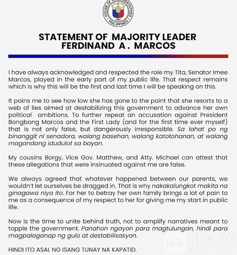 伯乐头条专讯:菲律宾政坛再度掀起惊涛骇浪。总统长子、国会众议院多数党领袖桑德罗·马科斯(Sandro Marcos)17日公开反击自己的亲姑姑——参议员艾美·马科斯(Imee Marcos)日前在集会上指控他与家人“吸毒”的言论,严厉批评此举“危险且极度不负责任”。