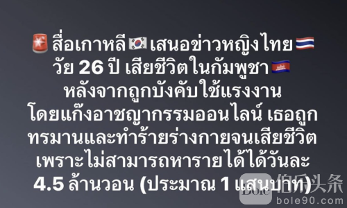伯乐头条专讯:柬埔寨波贝近期再曝网络诈骗园区虐待事件,一名26岁泰国女子因无法完成每日业绩被强迫劳动、殴打致死,引发社会关注。据报道,该女子在柬埔寨金边一座寺庙被发现死亡。事发后,专门协助诈骗受害者的Emmanuel基金会及时介入,阻止寺庙火化遗体,并向当地当局报案,要求对死因展开调查。目前,遗体已由泰国驻金边大使馆接管,正在协调将其运回泰国。