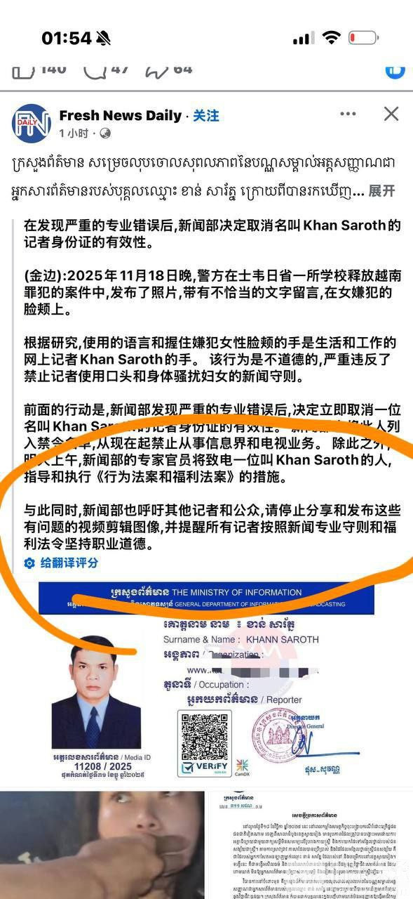 伯乐头条专讯:柬埔寨信息部 11 月 18 日宣布,针对近日网络热传的“木牌女侠”执法现场视频,涉事记者 Khann Sarath 因在报道过程中出现不当行为,已被立即撤销记者认证,并列入行业黑名单。