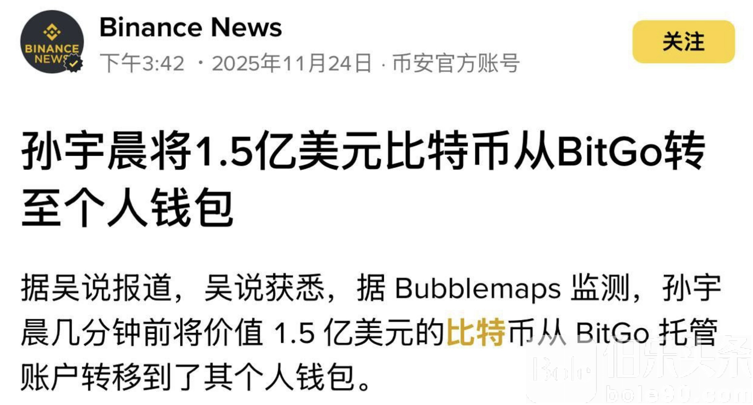 伯乐头条专讯:孙宇晨又出大动作!据币圈监测平台 Bubblemaps 最新数据显示,孙宇晨刚刚将价值约 1.5 亿美元的比特币,从 BitGo 托管账户突然转移至其个人钱包,一时间引发整个币圈高度紧张与疯狂猜测。