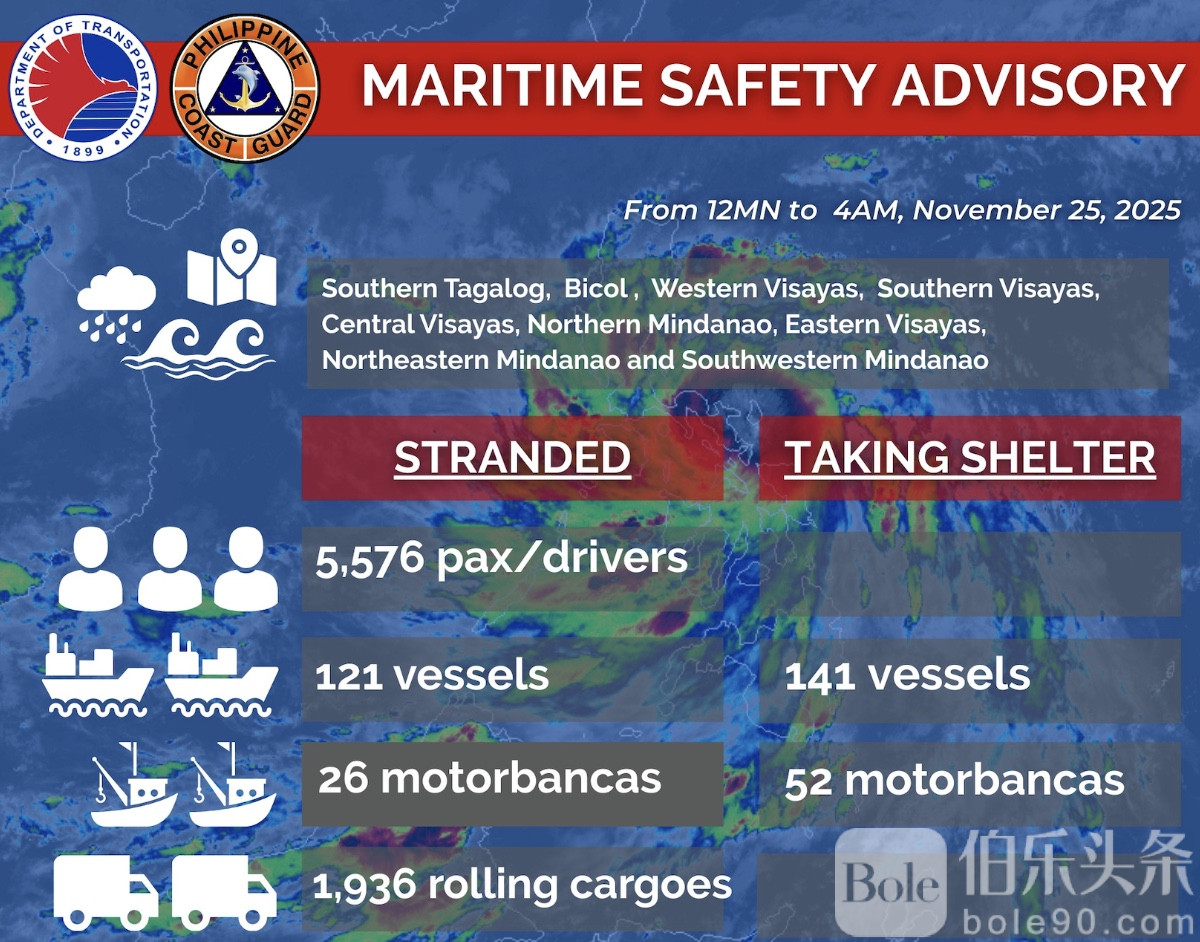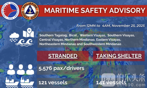 伯乐头条专讯:受热带低压“Verbena”影响,菲律宾海岸警卫队(PCG)11月25日发布最新海上安全公告,全国82个港口共有5,576名旅客、卡车司机与货运人员被迫滞留,交通几乎全面停摆。