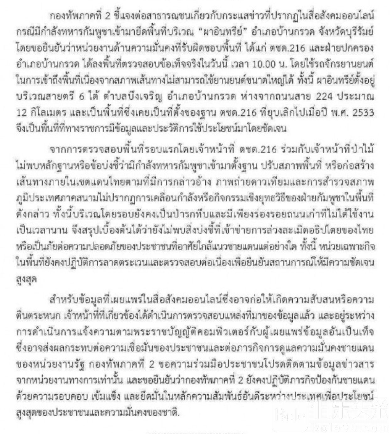 伯乐头条专讯:泰国第二军区紧急澄清柬军占据布里兰高地系假讯息 已启动调查追究造谣者。泰国 第二军区 121日正式向公众发布声明,针对社交媒体盛传柬埔寨军队越境占领布里兰府 鹰岩(ผาอินทรีย์一事表示,军方已经在第一时间派遣相关单位进入山区实地检查,并确认 并无任何柬军进入泰国领土、设点或进行军事活动,网传消息属于典型假讯息(Fake News