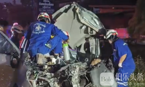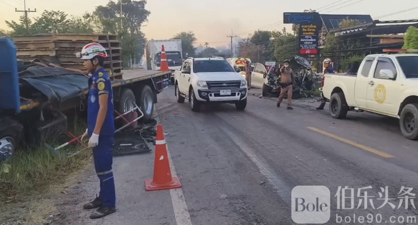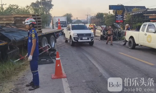 伯乐头条专讯:泰国武里南府3日清晨发生一起惨烈车祸,一辆皮卡疑高速行驶时突然与对向拖车迎面相撞,造成车头全毁、车顶被震开,副驾驶男子当场身亡,21岁女司机重伤被困,现场惨不忍睹。