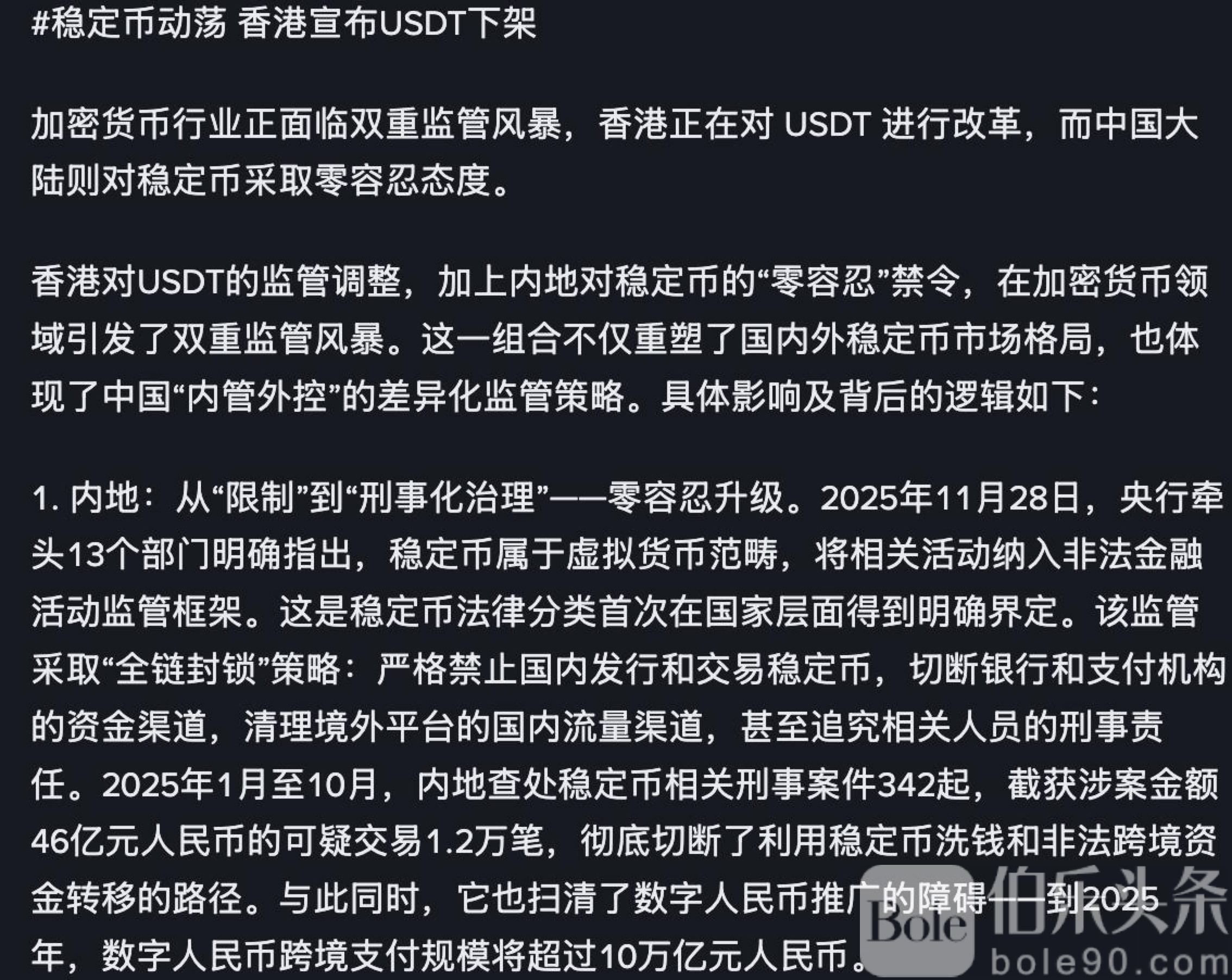 伯乐头条专讯:加密货币圈这两天可以说是“天亮前那阵风最冷的时刻”。随着香港正式宣布平台必须下架无牌稳定币、内地同步将 USDT 相关交易纳入刑事治理,全球流通量最大的稳定币正面临前所未有的双重监管夹击。业内不少人直呼:废了废了