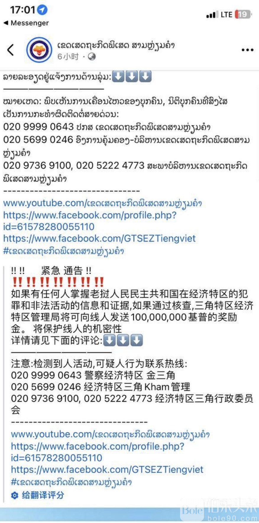 伯乐头条专讯:金三角经济特区这两天亮出了一张“重拳整治的新牌面”。特区管理机构联合公安、军方发布最新公告:凡是举报非法经营活动、违法人员线索并查实的,最高可获得一亿基普奖励。力度之大,让不少在地居民直呼“这是来真的”。