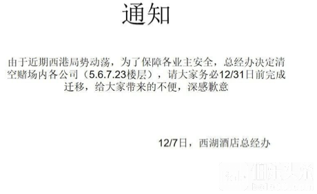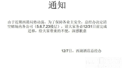 伯乐头条专讯:西港知名酒店“西湖酒店”近日传出重大变动,多名业内人士透露,酒店方面已通知原本在 5、6、7 楼办公的多家公司,需要在月底前全面搬离,引发当地员工与业内圈广泛关注。