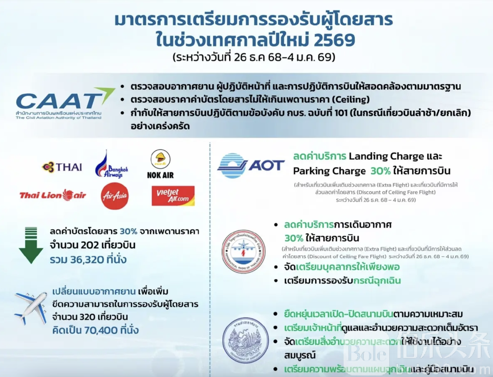 伯乐头条专讯:随着泰国新年返乡与旅游高峰临近,民航局(CAAT)联合6家航空公司推出系列措施,确保旅客出行顺畅、安全且经济实惠。民航局局长空军上将曼纳·楚纳普鲁透露,此次“新年出行特别计划”将202趟航班票价下调30%,并在302趟航班上调配更大机型,总计新增座位超过70,400个,覆盖曼谷、清迈、清莱、孔敬、宋卡、普吉、甲米、苏梅等主要城市及热门旅游城市。