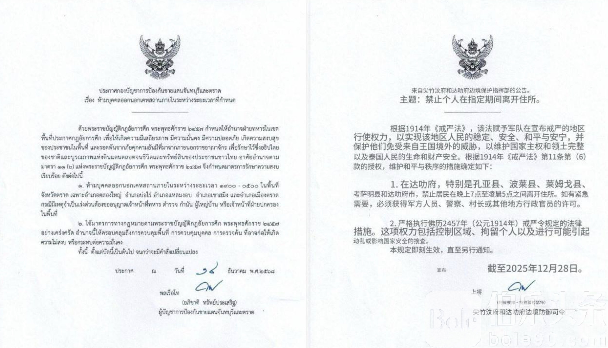 伯乐头条专讯:泰国东部边境局势骤然升温。泰国尖竹汶府与达叻府边境保护指挥部近日发布紧急公告,宣布达叻府5个县即刻进入紧急状态,并实施宵禁措施,禁止居民在夜间随意外出。官方措辞并不多,却释放出一个明确信号——安全风险,已不再停留在情报层面。