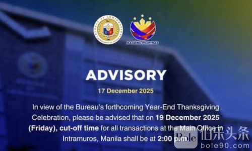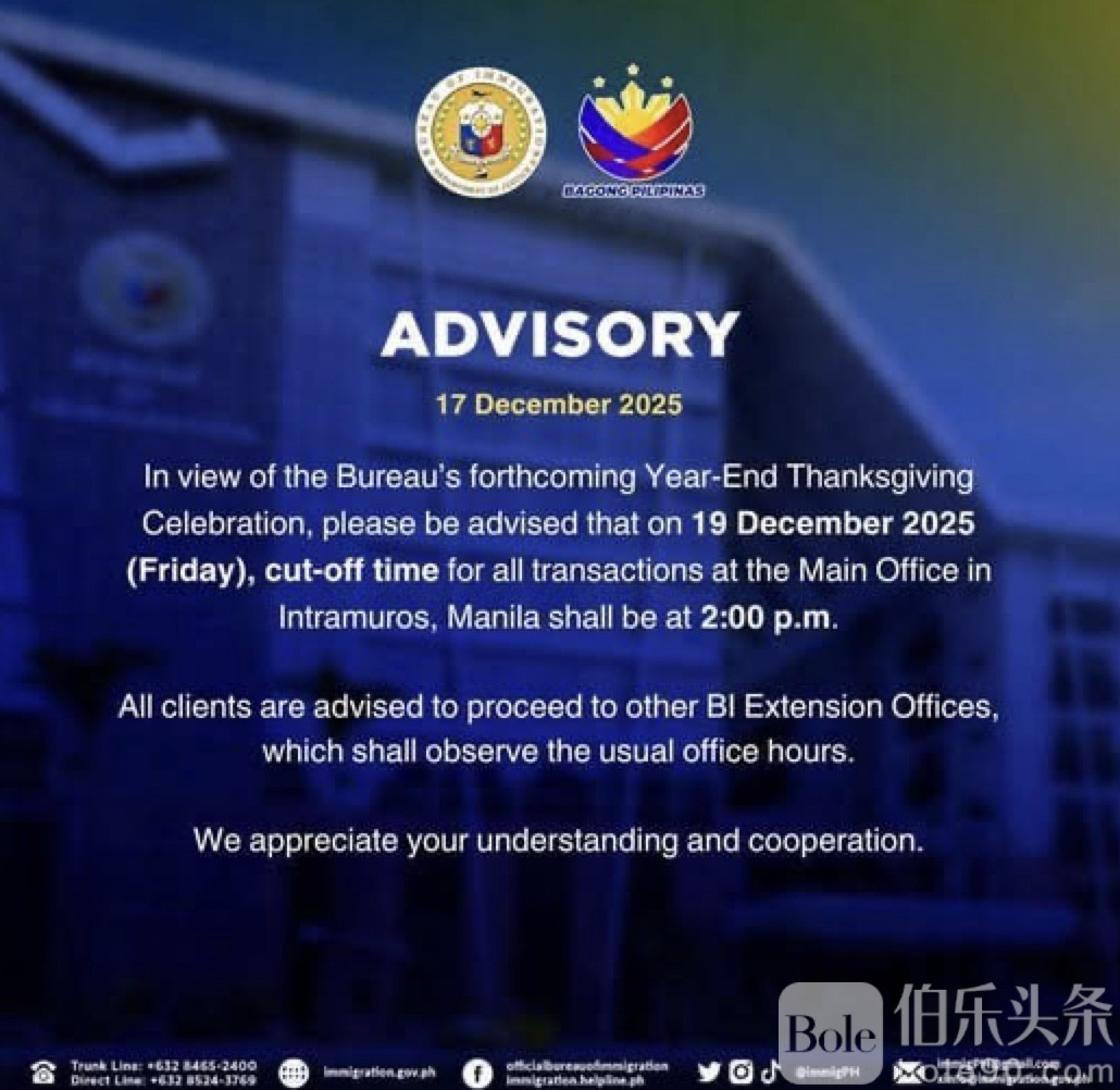 伯乐头条专讯:因菲律宾移民局即将举行年终感恩庆祝活动,马尼拉王城区移民局总局将对办公时间作出临时调整。移民局提醒公众,2025年12月19日(星期五)当天,总局所有对外业务将提前至下午2:00截止,请有办理需求的民众合理安排时间,避免白跑一趟。