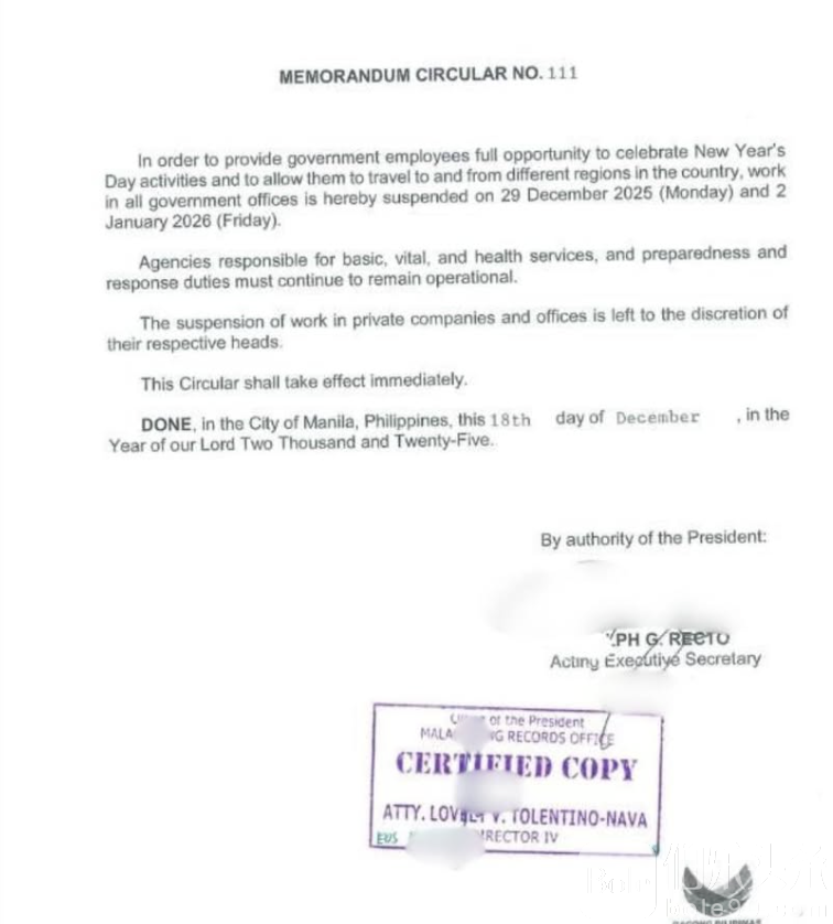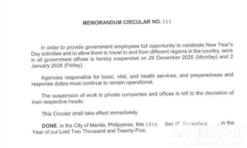 伯乐头条专讯:菲律宾马拉坎南宫于2025年12月18日正式宣布,12月29日(星期一)及2026年1月2日(星期四)政府机关将暂停办公,以便公务员及其家属有充足时间庆祝新年及安排跨区域出行。