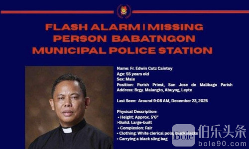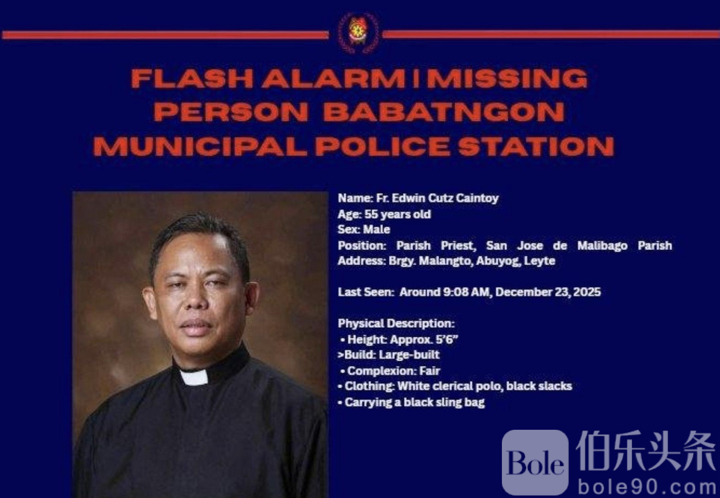 伯乐头条专讯:菲律宾警方证实,隶属巴洛教区(Archdiocese of Palo)的一名天主教神父在圣诞节期间被报告失踪,至今下落不明。失联事件发生在节日期间,也让当地教会与社区格外揪心。