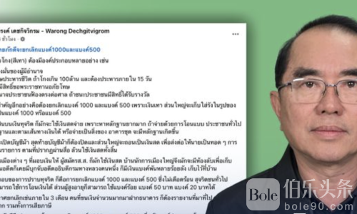 伯乐头条专讯:12月26日泰国爱国党党魁兼总理候选人诺帕·瓦朗科(นพ.วรงค์ เดชกิจวิกรม)近日在社交平台宣布,该党将提出废止500铢和1000铢钞票,以遏制灰色腐败与非法现金流。