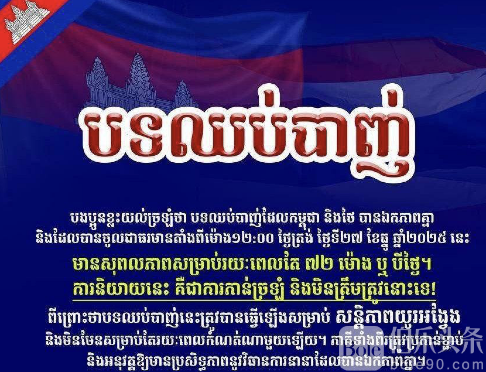 伯乐头条专讯:柬埔寨与泰国近日签署停火联合声明,但外界关于“仅72小时有效”的解读被官方否认。柬埔寨新闻部发布通告指出,此次停火旨在实现长期和平,而非短期休战,外界对于停火时限的误读与事实不符。