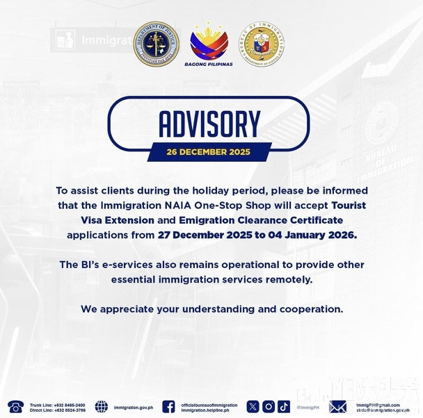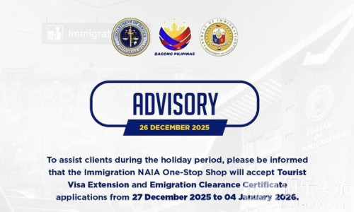 伯乐头条专讯:菲律宾移民局近日发布通告称,为避免假日期间业务“卡壳”,位于马尼拉尼诺·阿基诺国际机场(NAIA)的移民“一站式服务中心”将在2025年12月27日至2026年1月4日期间持续对外开放,照常受理旅游签证延期及出境许可(ECC)申请。