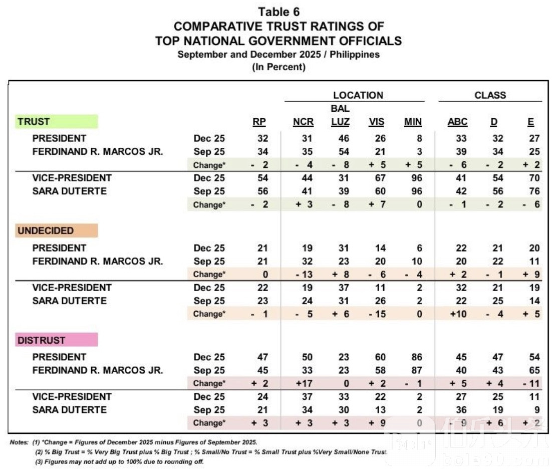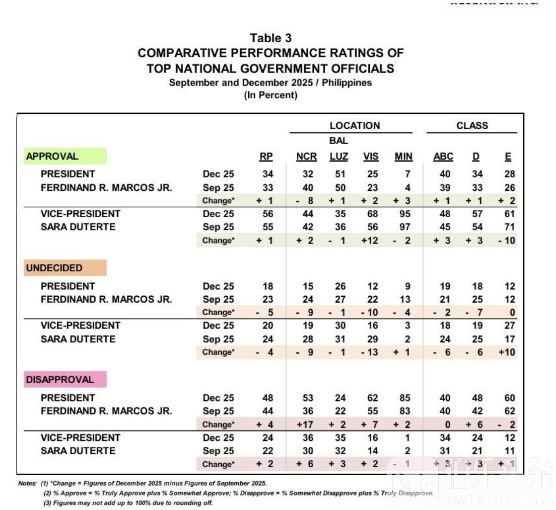 伯乐头条专讯:菲律宾最新一轮民调出炉,政坛风向再次引发热议。Pulse Asia 于12月发布的调查显示,总统小马科斯与副总统莎拉·杜特尔特的信任度在本月均出现小幅下滑,尽管幅度不大,却与当前持续发酵的反腐议题形成耐人寻味的呼应。