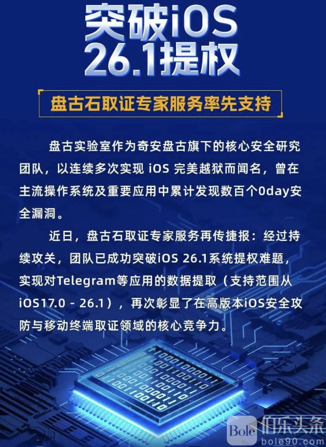 伯乐头条专讯:随着 iOS 26.1 的推出,奇安信科技集团旗下盘古石取证团队宣布,其取证专家服务已率先支持该系统的提权操作。这意味着,苹果手机上的数据在专业取证场景下,可能被直接读取和分析,风险不容小觑。