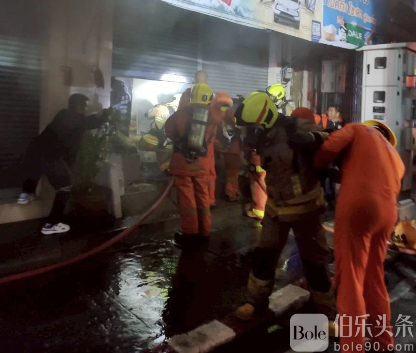 伯乐头条专讯:2026年1月5日深夜,泰国科拉府(Nakhon Ratchasima)市区曼纳斯路(Manat Road)一栋四层商铺“昌潘便利店”(Charoenphan Mini-Mart)突发火灾,火势从一楼迅速蔓延至三楼,现场浓烟滚滚,情况一度危急。消防及救援部门立即调派超过十辆消防车及支援设备前往扑救,最终成功控制火势,防止火势扩散至邻近商铺。