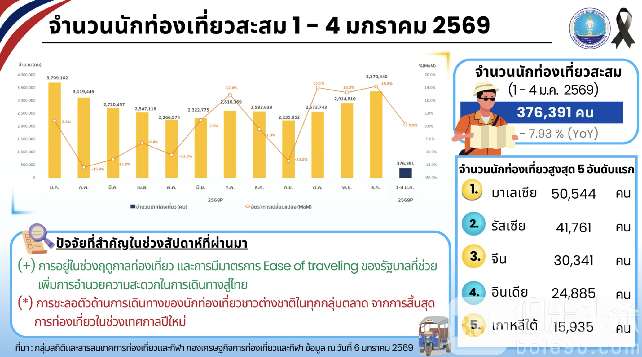 新年四天(1月1日至1月4日),泰国共接待外国游客376,391人次,实现消费收入约181.58亿泰铢。具体来源国为马来西亚(50,544人)、俄罗斯(41,761人)、中国(30,341人)、印度(24,885人)和韩国(15,935人)。旅游部门预计,下周入境人数仍可能略有下降,但随着欧洲、美洲地区旅游旺季到来及航班增加措施,入境游客仍有望回升。