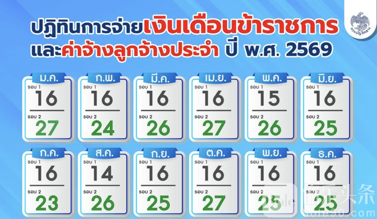 伯乐头条专讯:泰国财政部会计总处近日公布2026年公职人员及军人薪资、养老金发放日历,明确全年的发薪安排,以便相关人员合理安排财务。