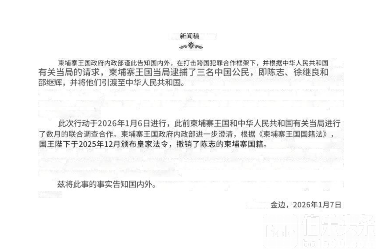 柬埔寨内政部发布的官方新闻稿指出,此次被引渡的三名中国公民分别为陈志、徐继良和邵继辉,已依程序移送至中国执法部门,接受后续法律调查。