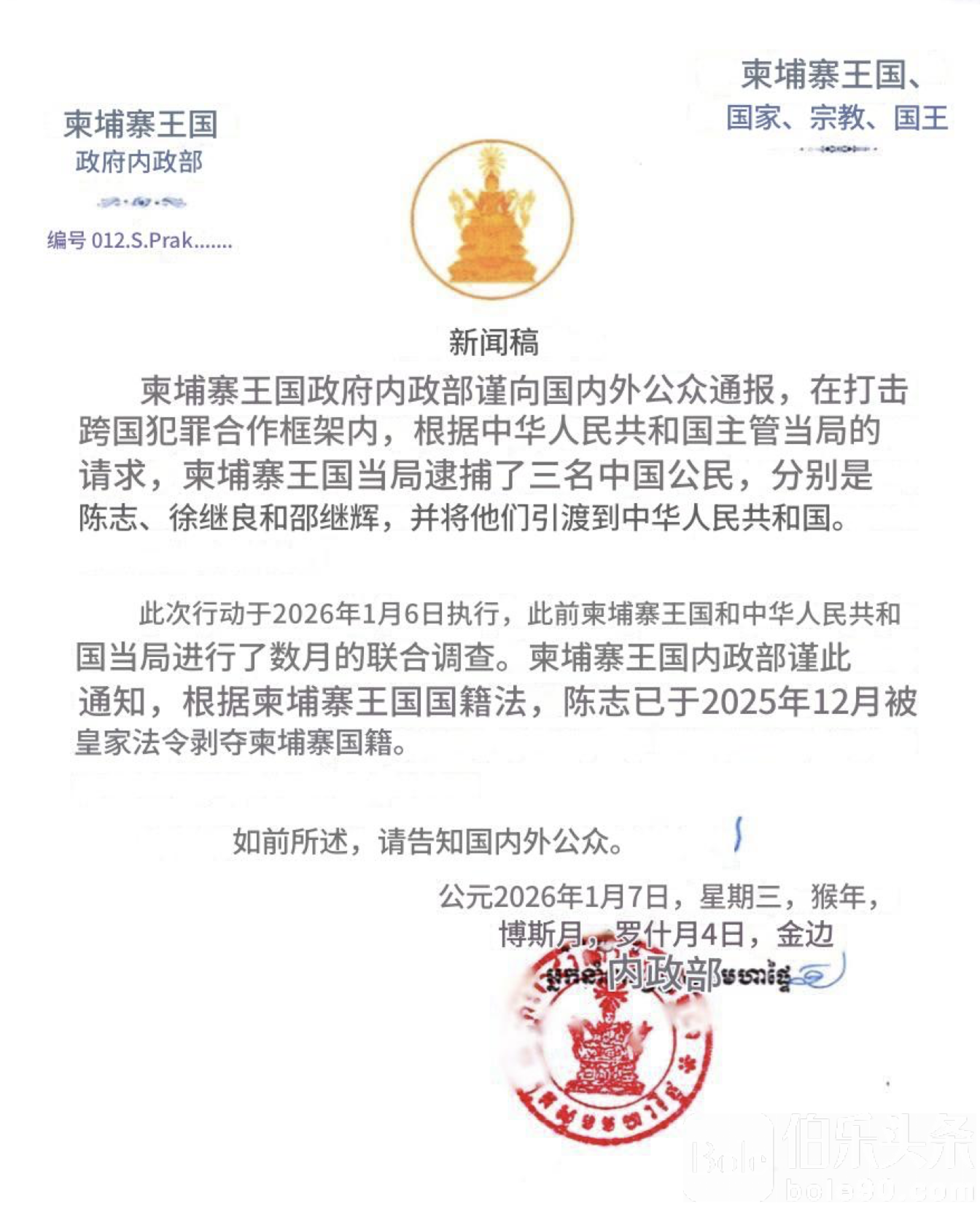 伯乐头条专讯:柬埔寨执法部门于2026年1月6日凌晨3时,在金边对知名中国商人、柬埔寨勋爵陈志及另外两名同伙展开抓捕行动。抓获后,三人已依法移送至中华人民共和国接受进一步调查和处理。