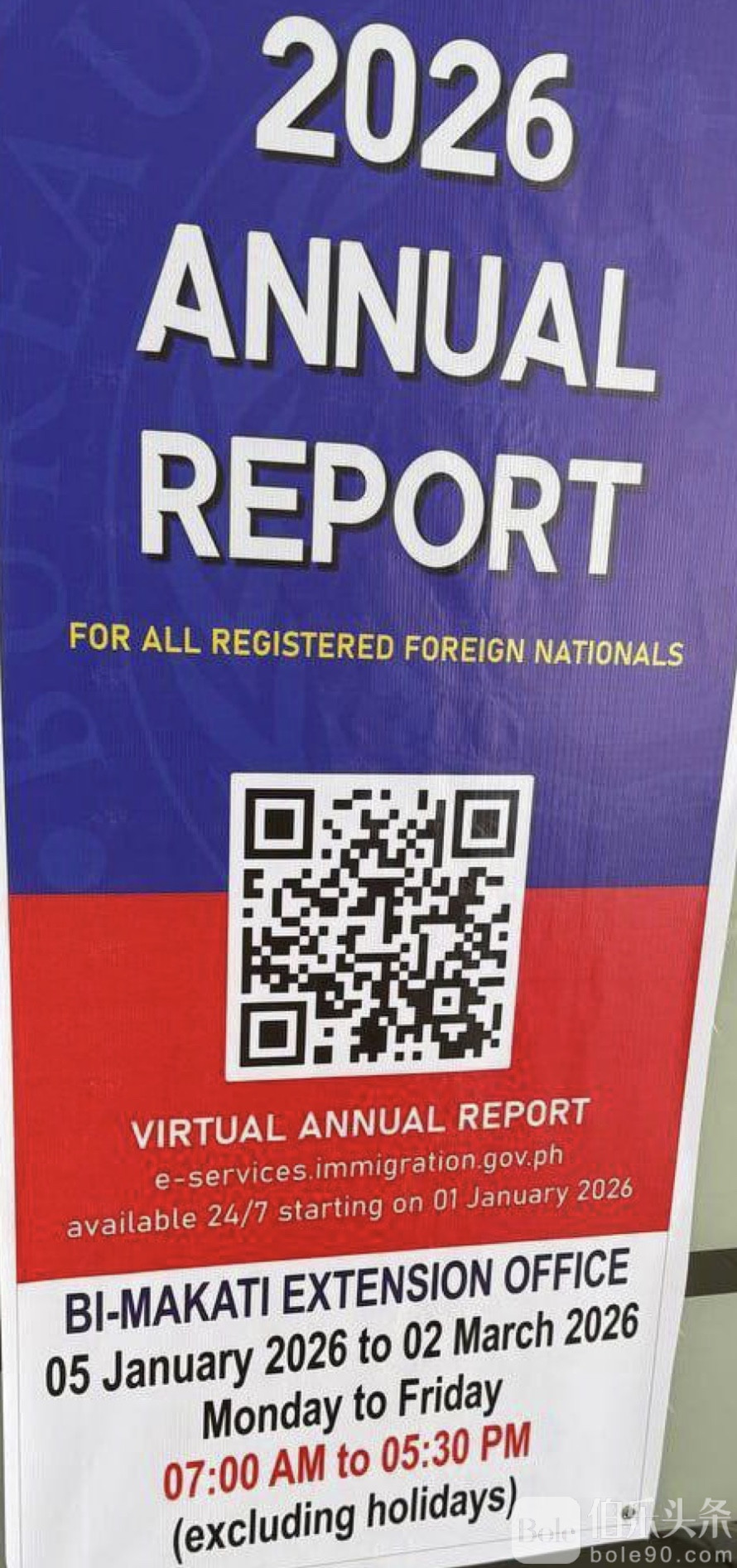 伯乐头条专讯:2026 年菲律宾移民局常年报到已正式启动,办理周期从 1 月 5 日持续至 3 月 5 日(因新年假期调整,原 1 月 1 日起始时间顺延)。
